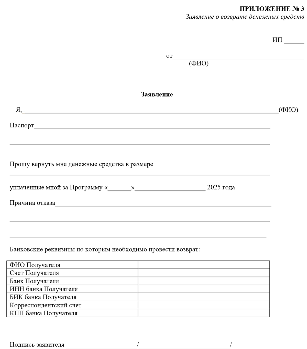 11.15.3.ПРИЛОЖЕНИЕ № 3 Заявление о возврате денежных средств