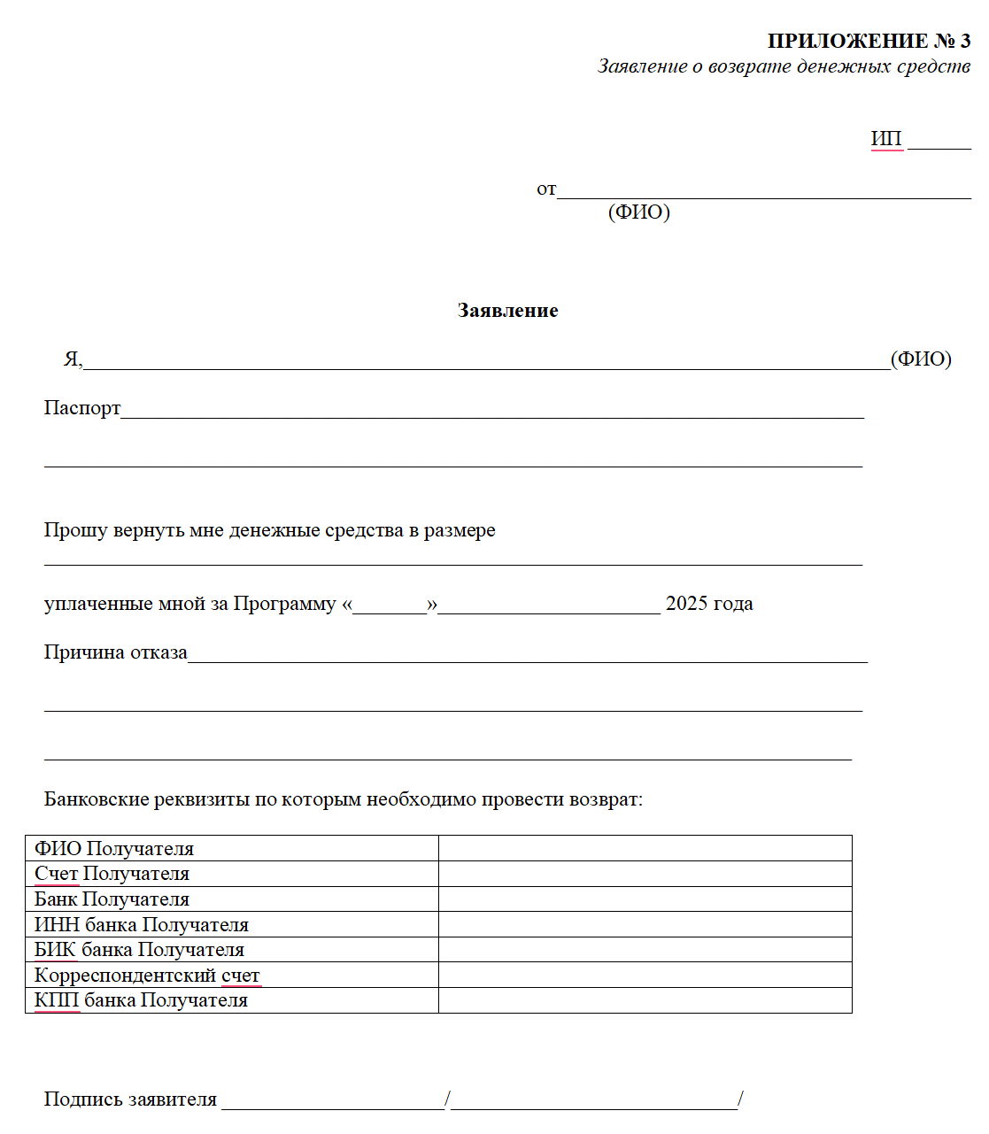 11.15.3. ПРИЛОЖЕНИЕ № 3 Заявление о возврате денежных средств