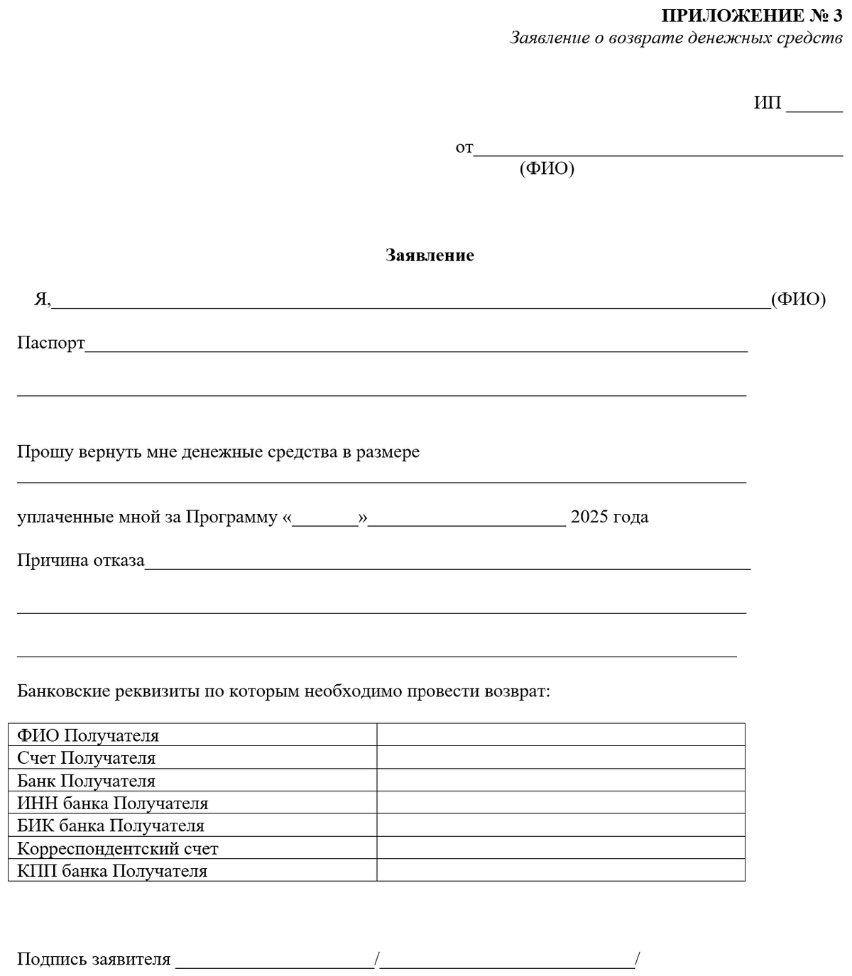 11.15.3. ПРИЛОЖЕНИЕ № 3 Заявление о возврате денежных средств