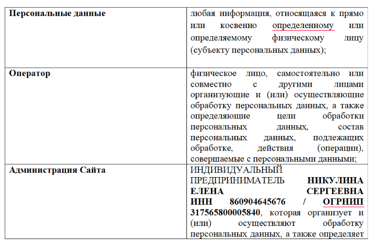 Настоящая Политика действует в отношении всех персональных данных, которые ИНДИВИДУАЛЬНЫЙ ПРЕДПРИНИМАТЕЛЬ НИКУЛИНА ЕЛЕНА СЕРГЕЕВНА